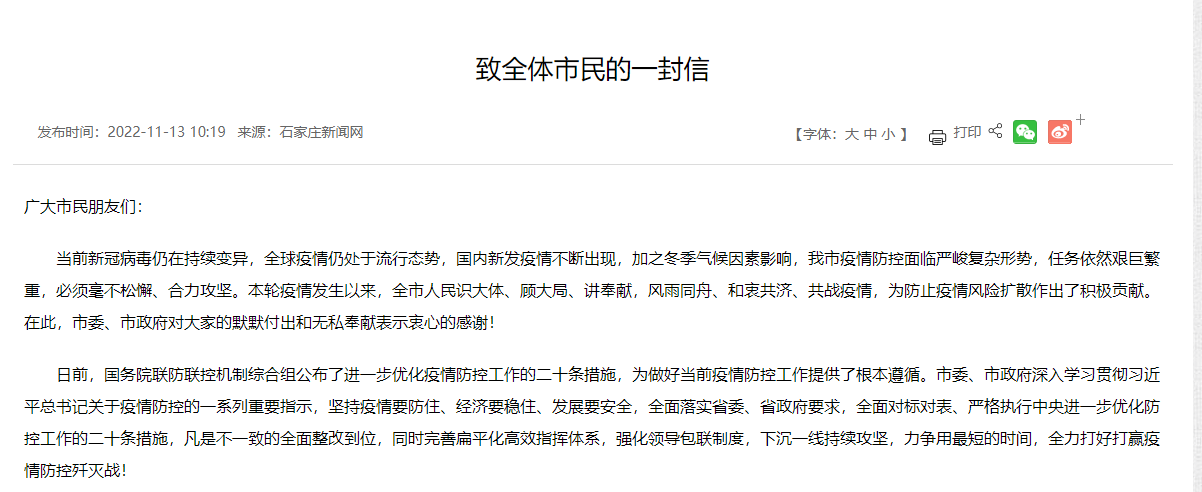 11月13日,石家庄发布致全体市民的一封信称,市委、市政府全面对标对表、严格执行中央进一步优化防控工作的二十条措施,凡是不一致的全面整改到位,同时完善扁平化高效指挥体系,强化领导包联制度,下沉一线持续攻坚,力争用最短的时间,全力打好打赢疫情防控歼灭战。