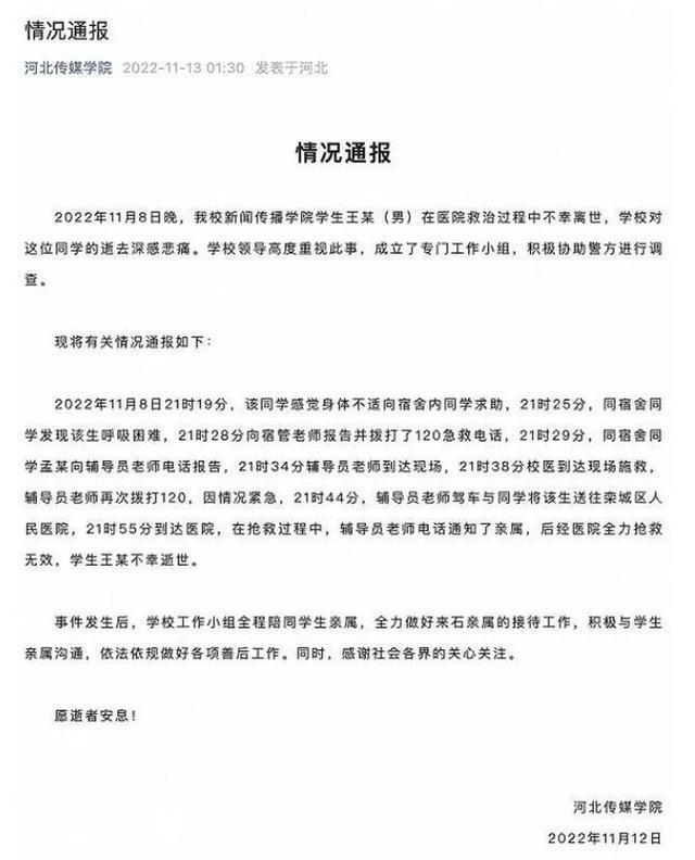 11月13日,河北传媒学院发布通报表示,目前学校已经就此事成立了专门的工作小组,正积极协助警方进行调查。同时,通报表示,事件发生后,学校工作小组将会积极与学生家属沟通,依法依规做好各项善后工作。