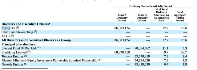 股东结构方面,创始人徐正持有每日优鲜8638万股普通股,持股比例12.2%,腾讯持股7.9%,属于老虎环球基金旗下的Internet Fund IV Pte.Ltd持股11.1%,青岛国资委实际控制的厦门每日优鲜持股7.8%,元生资本Genesis Entities持股6.4%。