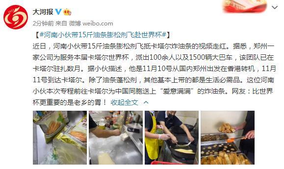 近日,河南小伙带15斤油条膨松剂飞抵卡塔尔炸油条的视频走红。据悉,郑州一家公司为服务本届卡塔尔世界杯,派出100余人以及1500辆大巴车,该团队已在卡塔尔驻扎数月。据小伙描述,他是11月10号从国内郑州出发在香港转机,11月11号到达卡塔尔。除了油条膨松剂,其他基本上带的都是生活必需品。这位河南小伙本次专程前往卡塔尔为中国同胞送上“爱意满满”的炸油条。网友:比世界杯更重要的是老乡的胃!