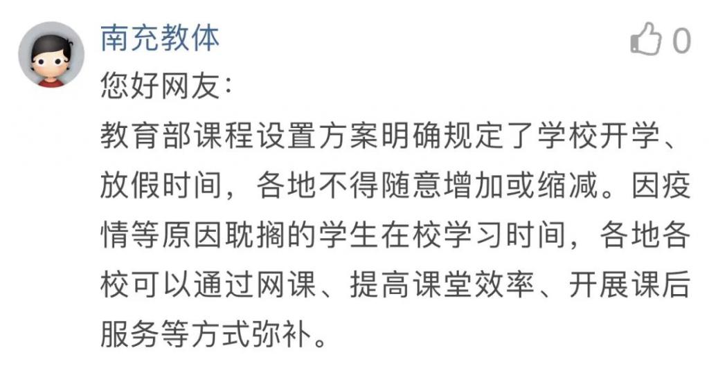 11 月 9 日,南充市教育和体育局就该网友建议作出了回复:教育部课程设置方案明确规定了学校开学、放假时间,各地不得随意增加或缩减——
