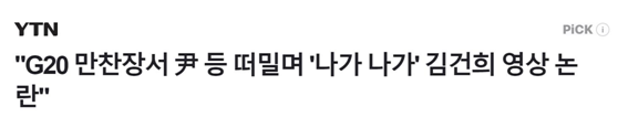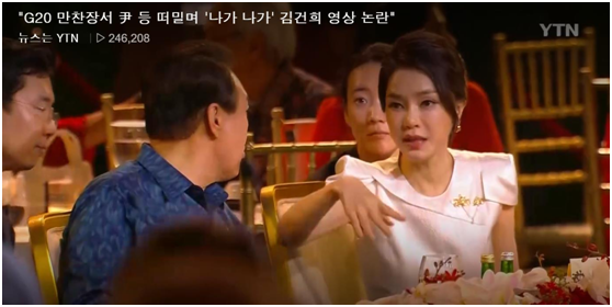 YTN电视台报道截图:G20欢迎晚宴上金建希推搡尹锡悦说“过去,过去”,相关视频引发争议