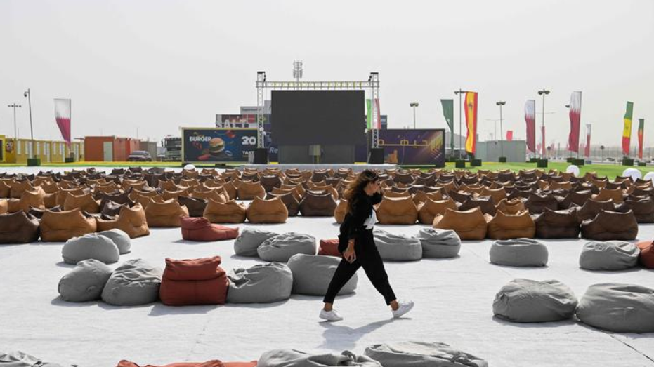 而在这些集装箱房屋外,有一个巨大的电子屏幕供球迷观赛,目前,各式各样的懒人沙发都已经就位。