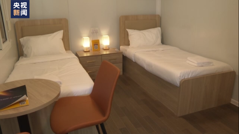 据央视新闻报道,集装箱式房屋都是中国制造生产的,板材主要来自广东和浙江两地。材料被运到卡特尔后,两到三位经验丰富的安装师傅,4个小时就能装好一套约16平米的房屋。