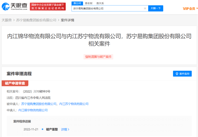 九派财经11月22日讯 天眼查APP显示,11月21日,苏宁易购集团股份有限公司、内江苏宁物流有限公司新增破产审查案件,申请人为内江锦华物流有限公司,经办法院为四川省内江市中级人民法院。
