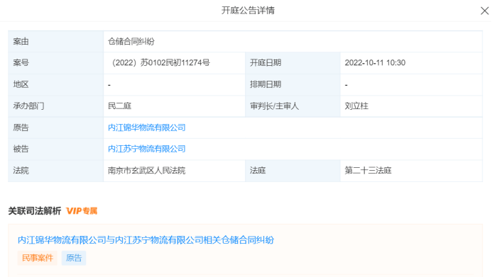 天眼查APP还显示,此前,内江锦华物流有限公司将内江苏宁物流有限公司告上法庭,案由为仓储合同纠纷。10月11日,该案件在南京市玄武区人民法院开庭。