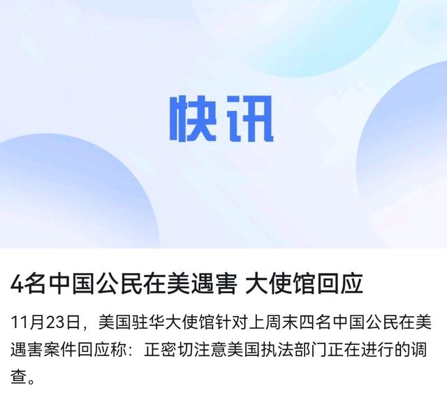 11月20日,在美国俄克拉荷马州汉纳希的枪杀事件中,经确认遇害的人包括4名中国人,三男一女。