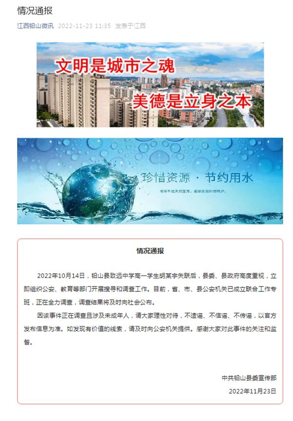 随后,中共铅山县委宣传部于23日上午11点35分发布该事件情况通报:2024年10月14日,铅山县致远中学高一学生胡某宇失联后,县委、县政府高度重视,立即组织公安、教育等部门开展搜寻和调查工作。目前,省、市、县公安机关已成立联合工作专班,正在全力调查,调查结果将及时向社会公布。