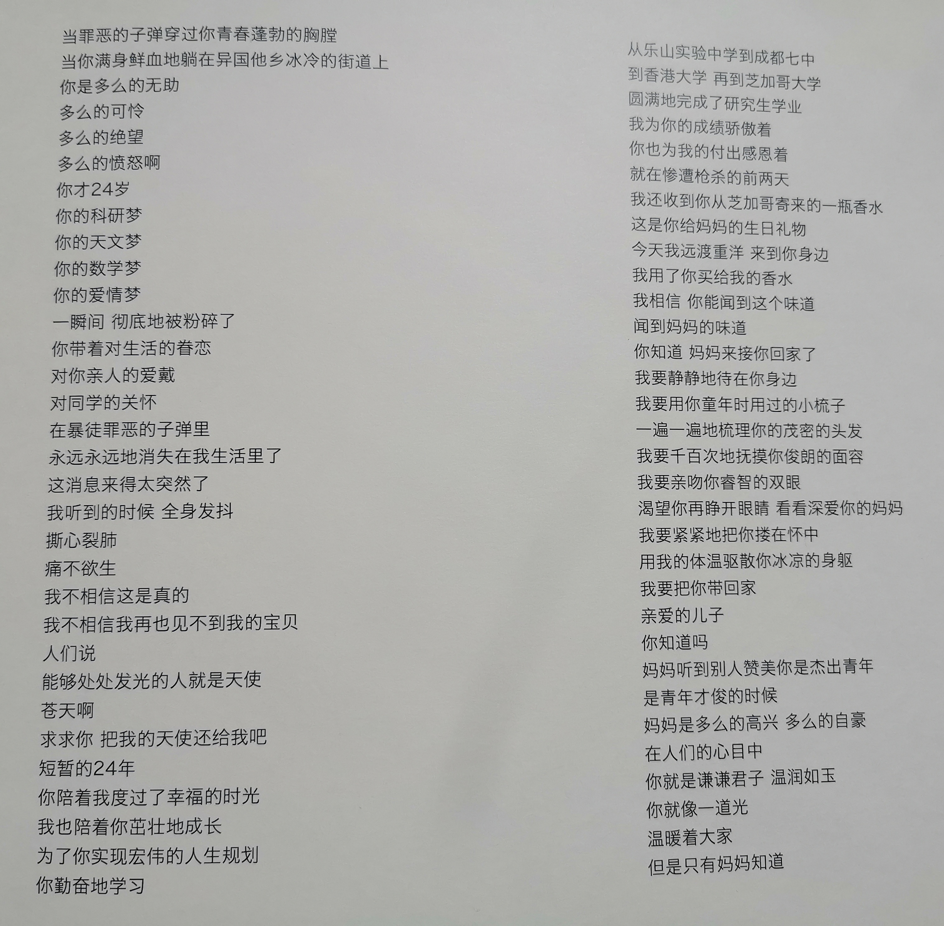 儿子出事后,他一个港大的同学给我发消息说:“有一次在香港看海,问他有什么比海更深的爱,他说是母爱。您的爱一直是他的翅膀,给他穿越所有风雨的力量”,“在香港每年的中秋节,和您打完电话,他都会哭好久。”