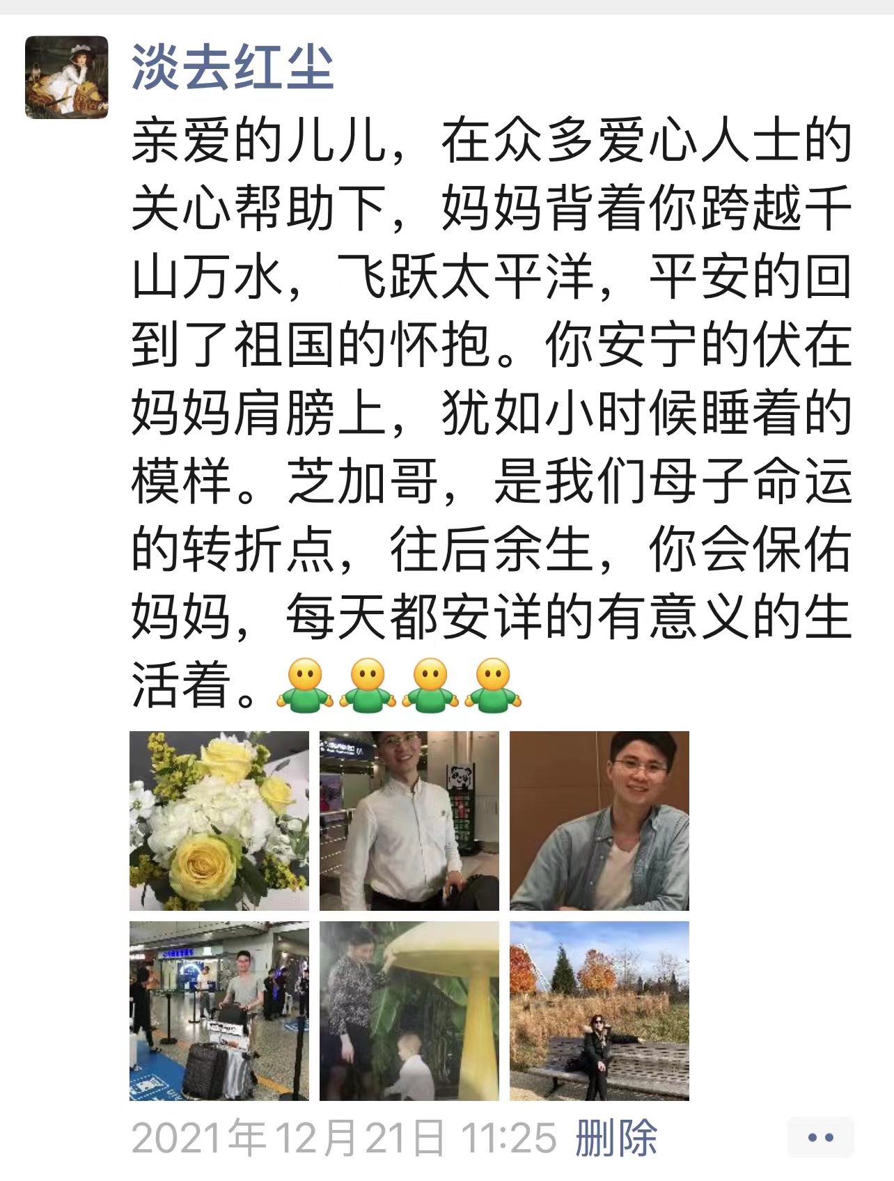 “今天我远渡重洋,来到你身边,我用了你买给我的香水,我相信你能闻到这个味道,闻到妈妈的味道,你知道妈妈来接你回家了……”
