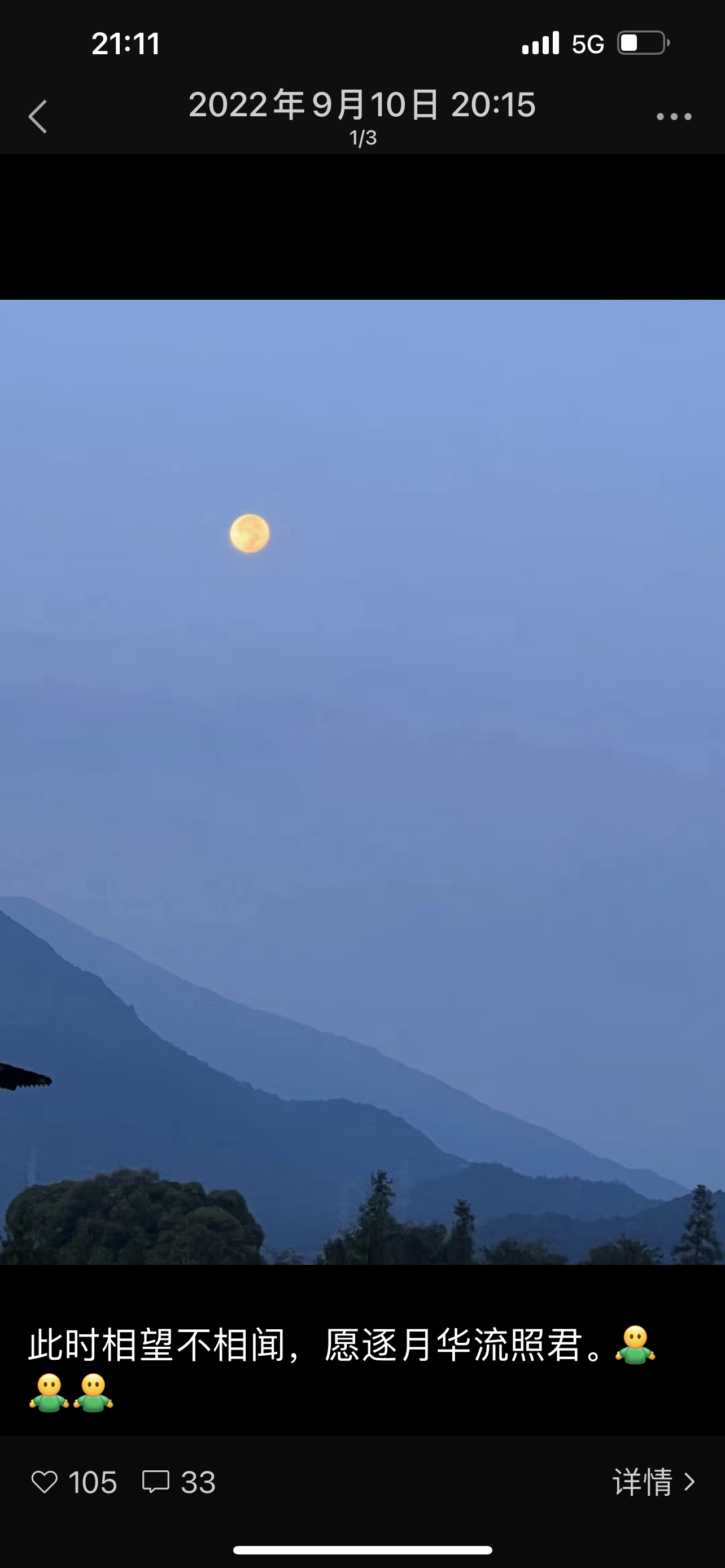中秋那天,我和朋友去了峨眉山。清晨,我拍了张月亮的照片,我想象着儿子在另一个世界,和我看相同的月亮,“此时相望不相闻,愿逐月华流照君”。