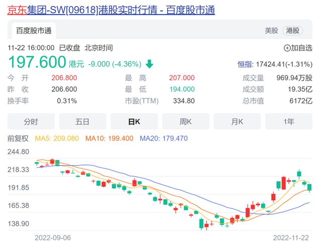 从二级市场看,进入11月来看,京东在港股的股价大幅反弹,最高涨幅超过50%。不过,近两日受到恒生科技指数回调影响,股价有所回撤,最新报收197.6港元,跌幅为4.36%,本月内累计涨幅为36.18%。