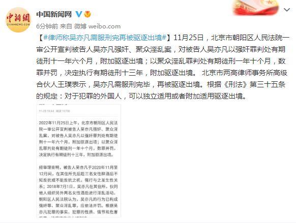 11月25日,北京市朝阳区人民法院一审公开宣判被告人吴亦凡强奸、聚众淫乱案,对被告人吴亦凡以强奸罪判处有期徒刑十一年六个月,附加驱逐出境;以聚众淫乱罪判处有期徒刑一年十个月,数罪并罚,决定执行有期徒刑十三年,附加驱逐出境。 北京市两高律师事务所高级合伙人王璞表示,吴亦凡需服刑完毕,再被驱逐出境。根据《刑法》第三十五条的规定:对于犯罪的外国人,可以独立适用或者附加适用驱逐出境。