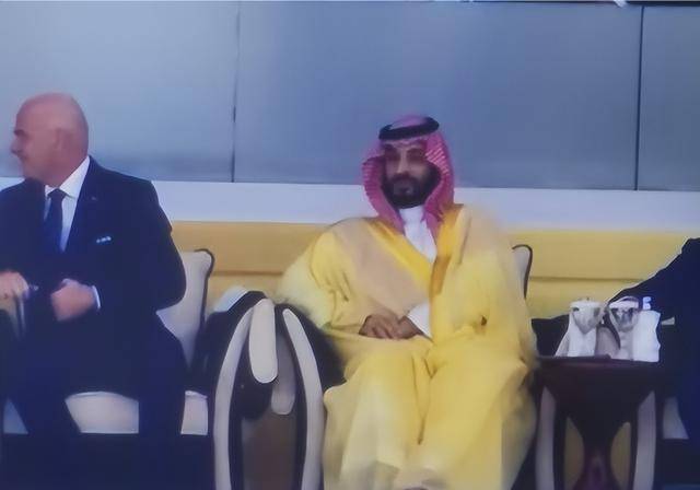 头戴红头巾的沙特王储、首相小萨勒曼、国际足联主席因凡蒂诺都在场边见证。