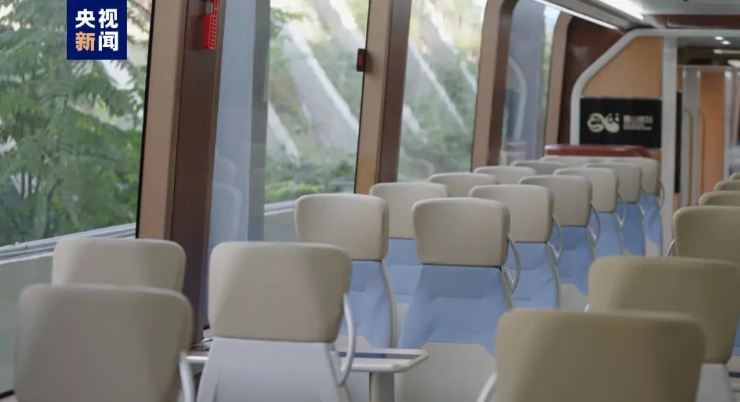 记者了解到,该列车创新采用了“轮轨+齿轨”双制式的牵引模式,在轮轨段最高运行速度可达120km/h,在齿轨段最高运行速度可达40km/h。此外,列车采用4节编组,额定载客数145人,内饰分为豪华VIP家庭式包厢、豪华观光卡座区、普通座区三种座位区,满足乘客多种乘车需求;具有国内最大面积曲面观光玻璃窗,可实现车内游客与自然景观的深度交流。
