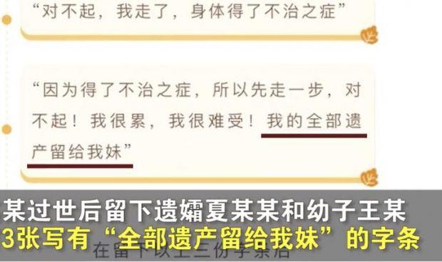 原来,男子王某某自杀身亡,留下遗孀夏某某和幼子王某,还有3张写有“全部遗产留给我妹”的字条。夏某某发现丈夫名下银行卡里160多万元被小姑子王某妮全部转走,其后王某妮又将钱转给自己母亲,夏某某向对方讨要被拒绝。