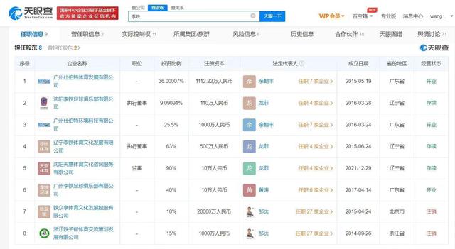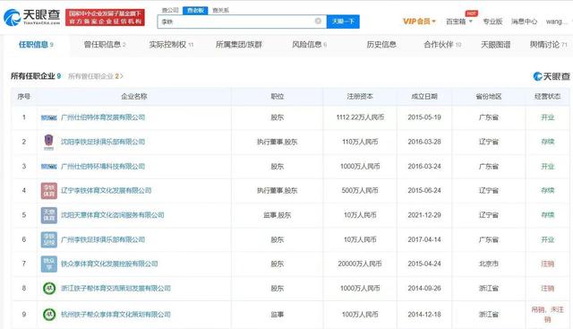 天眼查App显示,李铁共关联9家企业,其中6家为存续状态,包括广州仕伯特体育发展有限公司、沈阳李铁足球俱乐部有限公司、广州仕伯特环境科技有限公司(曾用名为广州仕伯特体育设备有限公司)等,均与体育相关。李铁在上述6家企业中均持有股份,同时在沈阳李铁足球俱乐部有限公司、辽宁李铁体育文化发展有限公司担任执行董事,在沈阳天意体育文化咨询服务有限公司担任监事。