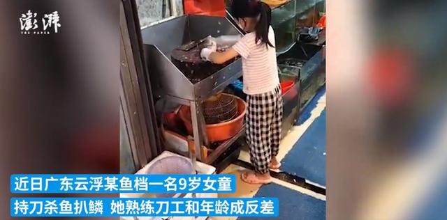 近日,广东云浮某鱼档一9岁女童持刀杀鱼扒鳞,熟练刀工和年龄成反差。其父表示,从小带她在身边,她自己喜欢学着做,一般在周末完成作业后来帮忙。