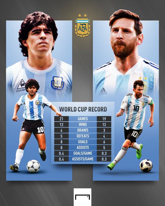 作为对比,马拉多纳总共进行过21场世界杯比赛,12胜4平5负,进8球8助攻,场均进球和助攻均为0.4,最好成绩为一冠一亚。