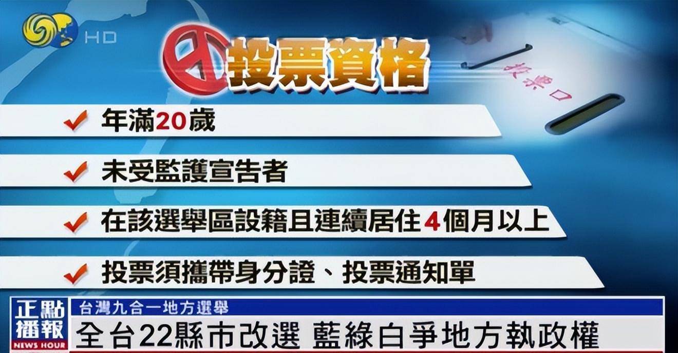 依照台湾地区相关法规,需要年满20岁且未受监护宣告,以及在所属选举区设籍,且连续居住4个月以上才有投票资格。投票民众至少会拿到3张选票,分别选出地方的县市首长、所在选区的县市民意代表和基层里长。