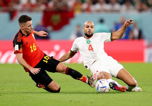 11月27日,摩洛哥队球员索夫扬·阿姆拉巴特(右)与比利时队球员索尔根·阿扎尔拼抢。新华社记者郑焕松摄