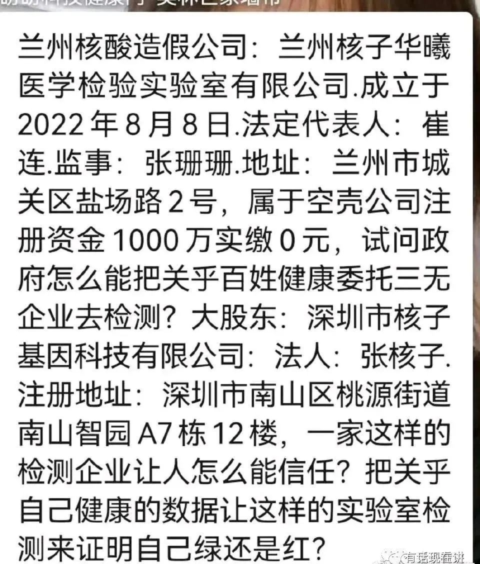 在全国注册了三十五余家核酸检测机构,哪里有她的公司,哪里疫情爆发!”——今日各中文平台顶流热搜:兰州卫健委一份通告,让“核子华曦”和其背后的“张珊珊”引起了网友关注。。。