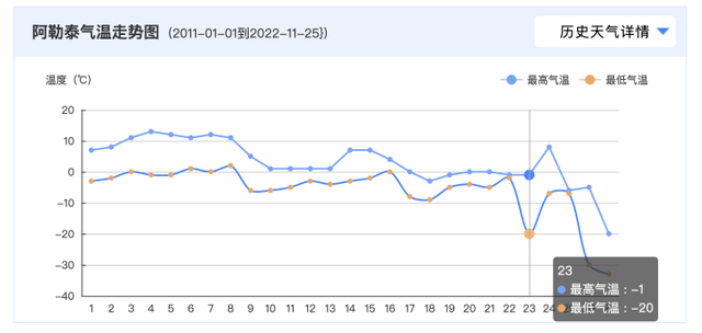 从11月25日起,新疆气象台连续三天发布寒潮预警,26日更是发出2008年以来新疆首个寒潮红色预警。以阿勒泰地区为例,天目新闻记者查询其过去一个月的气温走势,自11月22日开始,天气从0度左右,直接下降到零下20多度,气温变化异常迅速。