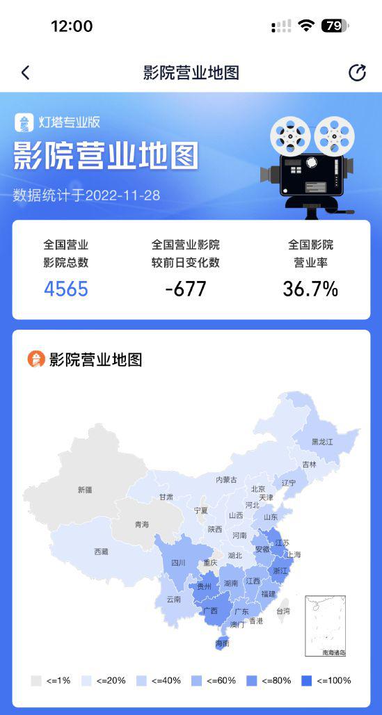 11 月 29 日,据灯塔专业版影院营业地图显示,统计时间截至今日 12 点,11 月 28 日全国营业影院 4565 家,全国影院营业率 36.7%。据悉,营业影院是指有票房上报的影院。