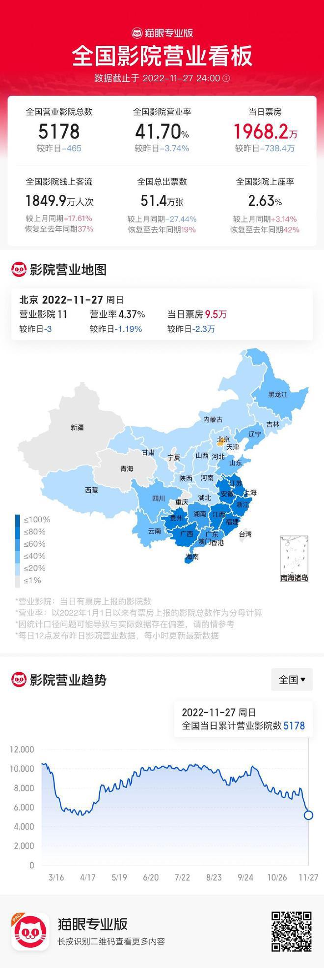 网易娱乐 11 月 28 日报道 据猫眼专业版,11 月 27 日全国影院营业率 41.7%,连续四日营业率不足 50%;全国营业影院总数 5178 家,为近半年最低。