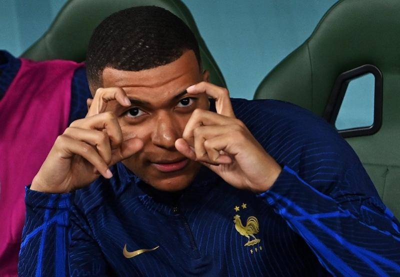 11月30日,法国队球员姆巴佩在替补席上合影留念。