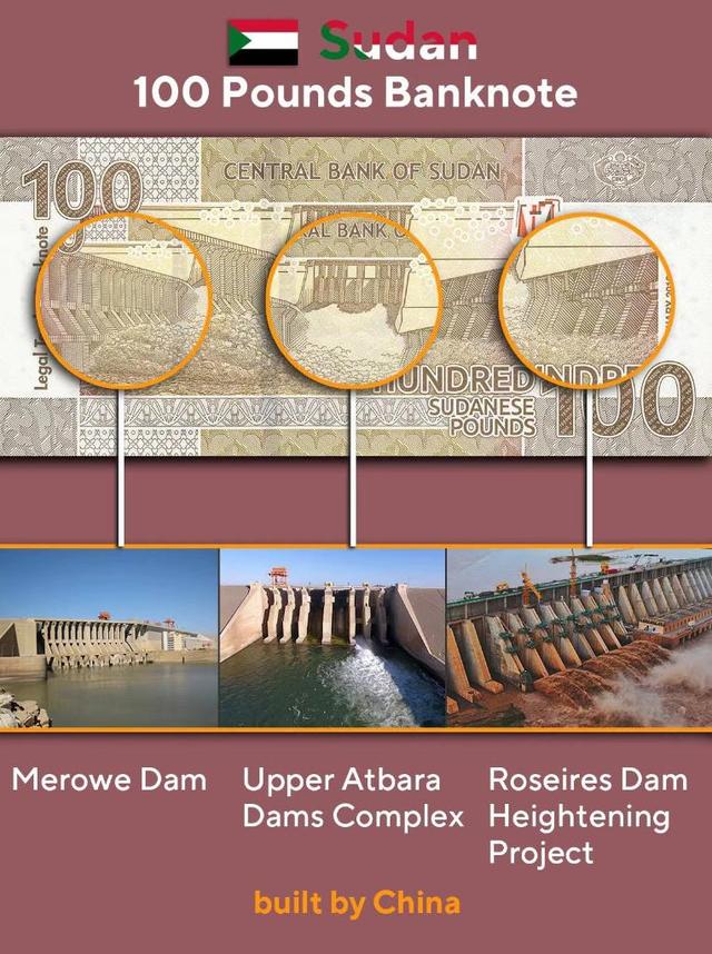 ↑苏丹面额100苏丹镑纸币——麦洛维大坝、上阿特巴拉水利枢纽和罗赛雷斯大坝。