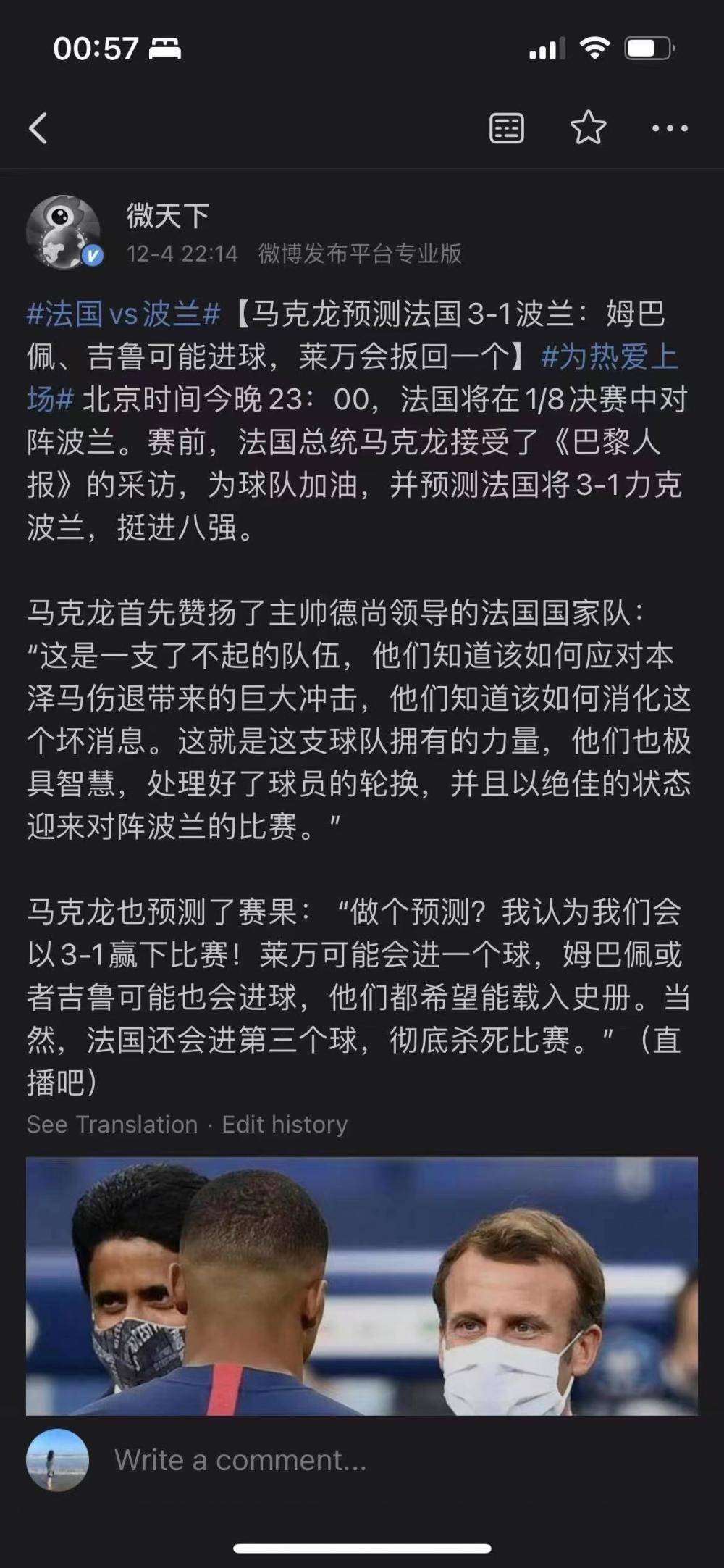 马克龙成功预测法国队比分