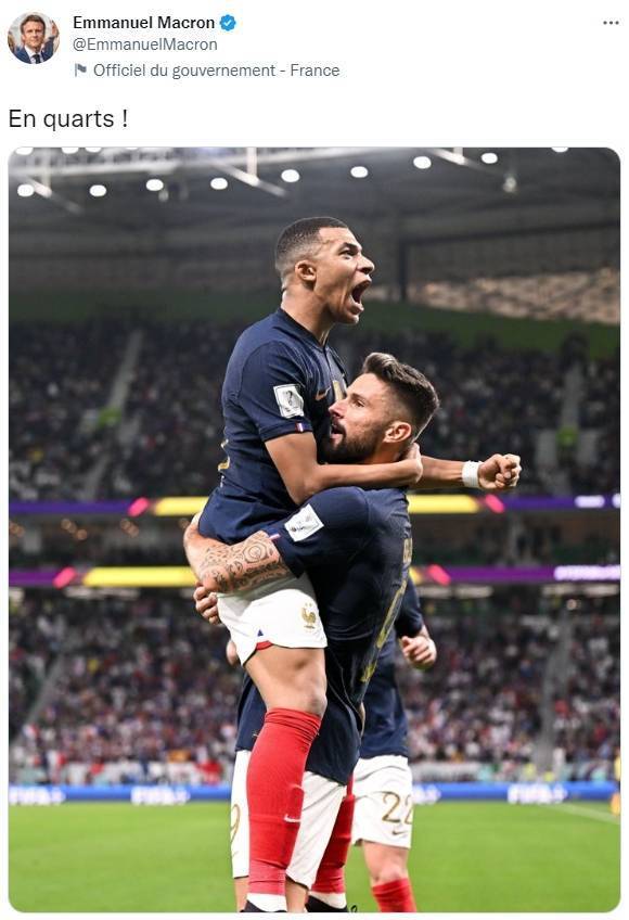赛后,马克龙通过个人社交媒体晒照庆祝:“挺进1/4决赛!”