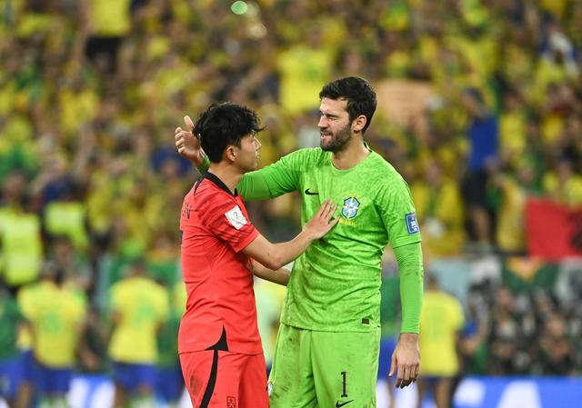 12月5日,巴西队守门员阿利松(右)与韩国队球员孙兴民致意。