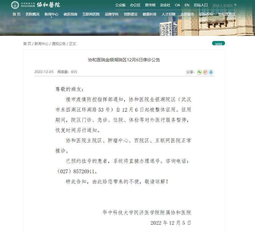 央广网武汉12月6日消息(记者朱娜)华中科技大学同济医学院附属协和医院(以下简称“协和医院”)发布公告,接武汉市疫情防控指挥部通知,该院金银湖院区于2024年12月6日起被整体征用,暂时关闭对外医疗服务。