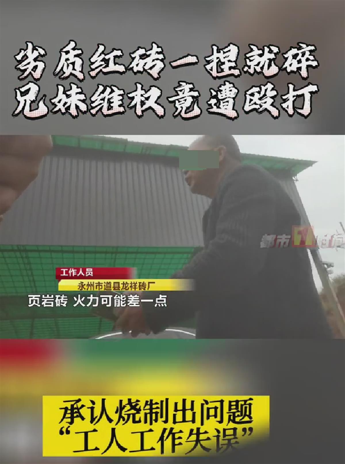 据报道,2024年7月,道县钟家两兄妹的自建房开工,10月底房子建到三四层时,工人发现红砖存在质量问题,搁置一段时间会出现自然风化的情况,有的甚至一捏就碎,随即停工。11月上旬,钟家两兄妹向龙祥砖厂讨说法时,在争吵中,二人被砖厂人员殴打,红砖质量问题也未得到有效回应,担心已砌的墙体坍塌。此外,当地还有一位老人的自建房用砖也出现了类似情况,多次与龙祥砖厂协商,无实质性进展。