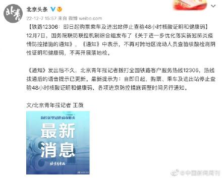 12月7日,国务院联防联控机制综合组发布了《关于进一步优化落实新冠肺炎疫情防控措施的通知》,《通知》中表示,不再对跨地区流动人员查验核酸检测阴性证明和健康码,不再开展落地检。 《通知》发出后不久,北京青年报记者拨打全国铁路客户服务热线12306,热线拨通后的语音提示已更新。最新提示为:自即日起,购票、乘车及进出站停止查验48小时核酸证明和健康码,各项进京防控措施调整时间另行通知。(北京头条)
