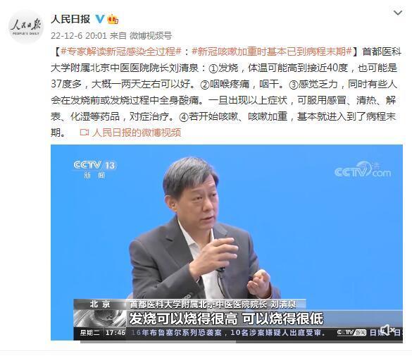 首都医科大学附属北京中医医院院长刘清泉:①发烧,体温可能高到接近40度,也可能是37度多,大概一两天左右可以好。②咽喉疼痛,咽干。③感觉乏力,同时有些人会在发烧前或发烧过程中全身酸痛。一旦出现以上症状,可服用感冒、清热、解表、化湿等药品,对症治疗。④若开始咳嗽、咳嗽加重,基本就进入到了病程末期。