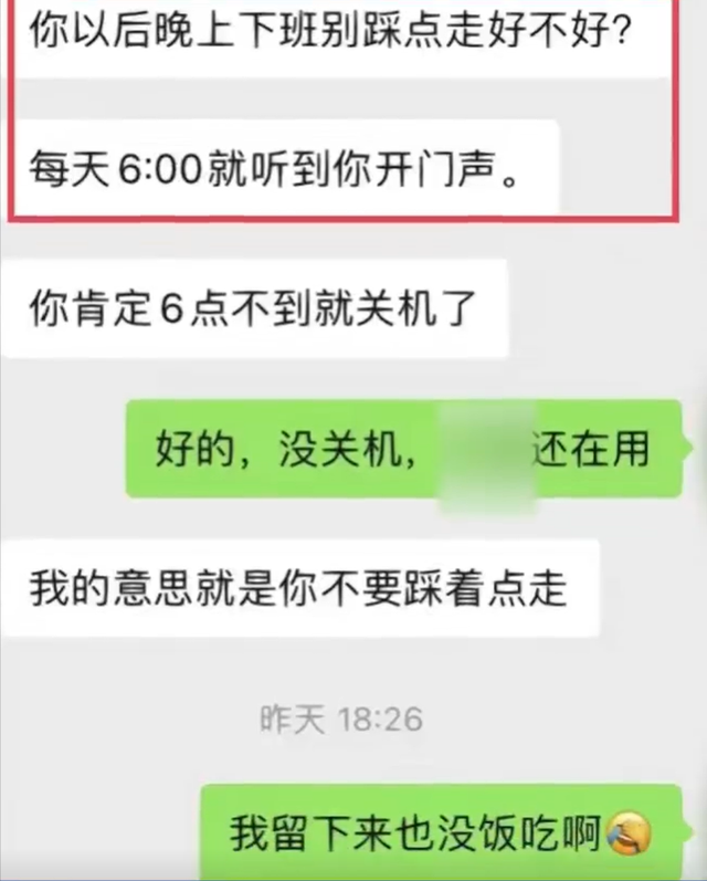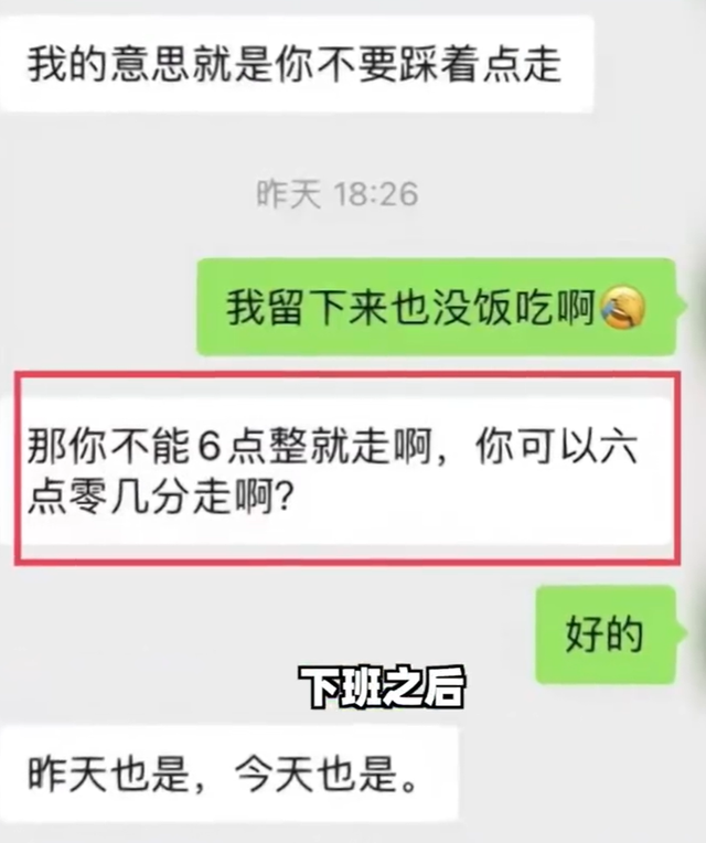 聊天纪录显示,公司领导要求这名女子以后下班不要踩点走,“可以六点零几分再走。”女子则回复道,“我留下来也没饭吃啊。”
