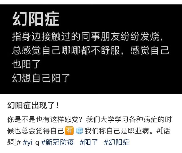 最近,网络上频频冒出一种新的“不明疾病”——“幻阳症”。广大网友纷纷表示自己出现了此疾病的诸多“症状”:1、总觉得自己身体哪里不舒服,咽痛、头痛、肌肉酸痛……2、参照网上或身边阳了的亲友的症状反复比对自身,对身体感受过度警觉与检查,例如多次吞咽口水以判断嗓子是否干疼、身体感到燥热便忍不住测量体温、肌肉有酸痛便担心是不是出现症状、一天多次测抗原等等;3、关注相关信息动态,例如身边有谁阳了、阳了有什么症状、多少人阳了、阳了后会如何……4、反复询问、分析、判断自己是否有接触阳性人员或环境的可能性及接触时间等等;5、既担心自己是否阳了,又希望早点阳了算了。
