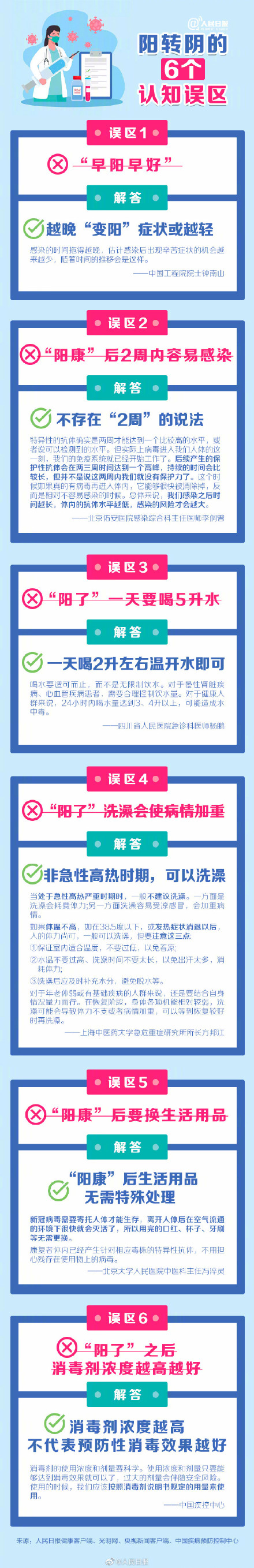 早阳早好?越晚变阳症状或将越轻;②“阳康”后2周内容易感染?不存在“2周”的说法;③“阳了”一天要喝5升水?一天喝2升左右温开水即可;④“阳了”洗澡会使病情加重?非急性高热时期可以洗澡。更多常见的认知误区转发周知! (人民日报)
