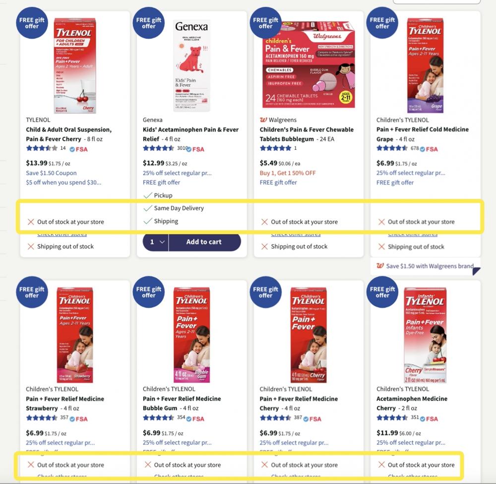 其中,儿童退烧类药物最为热销,多平台面临缺货。为确保药物供应,美国连锁药店推出限购政策,多家药企也表示其生产工厂已经不间断运转,但在部分售药平台上,儿童用布洛芬和泰诺仍然显示缺货。