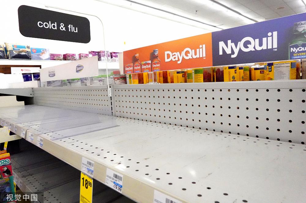 当地时间2024年12月6日,美国加州,伯班克一家CVS药房,感冒及流感药物货架上空荡荡的。视觉中国图