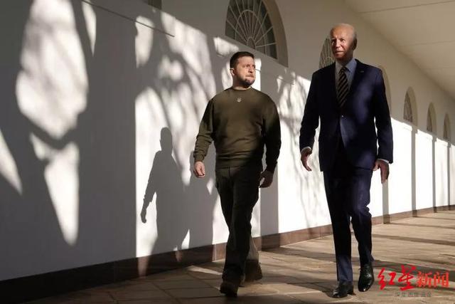 ↑当地时间21日,乌克兰总统泽连斯基和美国总统拜登沿着白宫柱廊走向椭圆形办公室