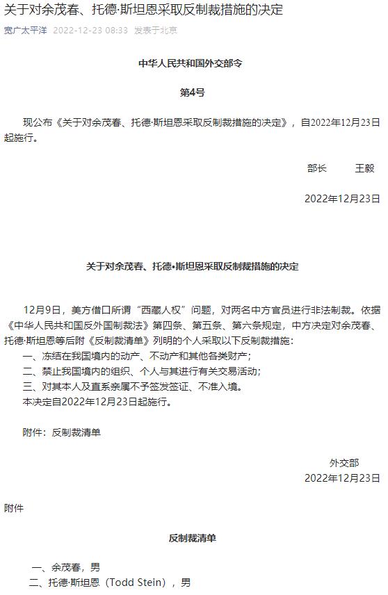 12月23日,外交部发布《中华人民共和国外交部令 第4号》和《关于对余茂春、托德·斯坦恩采取反制裁措施的决定》: