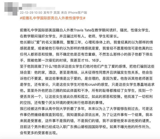 12月29日,有微博用户发帖称,她于2017年在湖南省长沙市雅礼中学就读期间,遭到一名为“Travis Tate”的外籍男教师骚扰和性侵。当时,她还是未成年人。