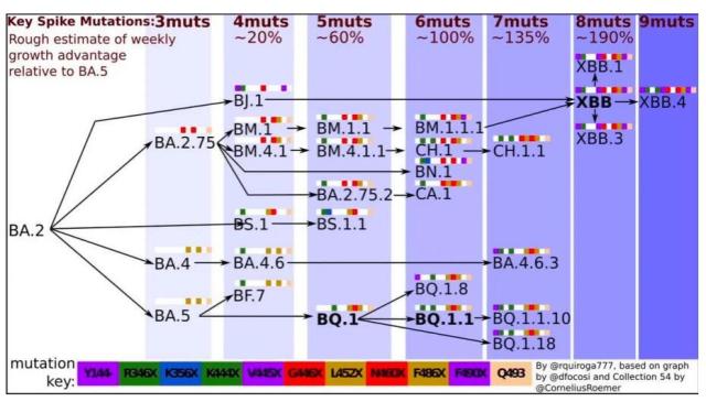 从上图可见,当前在欧美地区以及中国流行的几大毒株,都是由BA.2变异而来。徐建青教授分析,XBB.1不会比Omicron BA.2造成更大震荡,因为它是在BA.2的基础上出现的;同时,疫苗接种与本轮的BA.5.2/BF.7感染诱导的T细胞应答和抗体应答所形成的免疫屏障,对后续的XBB.1的流行将产生重大影响。