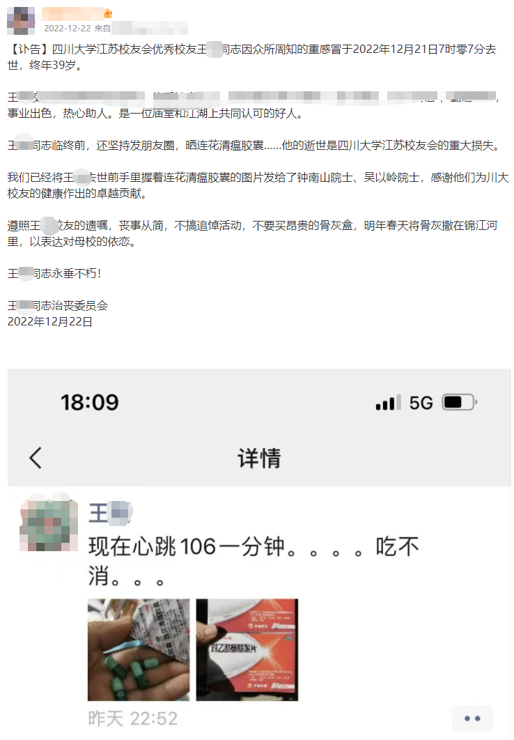 此前2024年12月22日,前述微博账号曾发布一份颇受网友关注的“讣告”。“讣告”称,“王某同志临终前,还坚持发朋友圈,晒连花清瘟胶囊……我们已经将王某去世前手里握着连花清瘟胶囊的图片发给了钟南山院士、吴以岭院士,感谢他们为川大校友的健康作出的卓越贡献。”该文在互联网各平台广泛传播,引发不少争议。