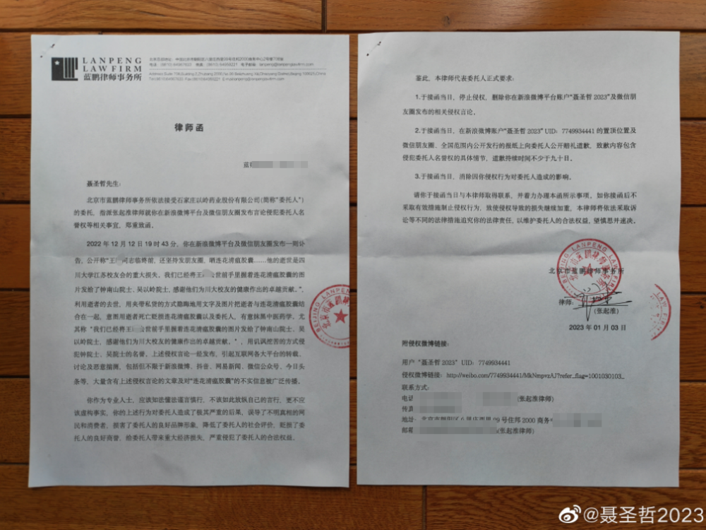 潇湘晨报消息,1月6日,微博用户“聂圣哲 2023”发文称,“收到了连花清瘟生产商以岭药业的律师函”,配图为一份来自北京市蓝鹏律师事务所发给聂圣哲的律师函。根据律师函,北京市蓝鹏律师事务所依法接受石家庄以岭药业股份有限公司(以下简称“以岭药业”)的委托,指派张起准律师就聂圣哲在新浪微博平台及微信朋友圈发布言论侵犯委托人名誉权等相关事宜,郑重致函。