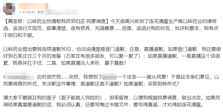 聂圣哲称,因此征求网友们的意见,“以民意调查的形式,来决断这件事情:是道歉还是不道歉?如果道歉,采取哪种形式?请大家不要顾及我的面子,坦率留言,以便我根据民意调查,作出决定。如果民调结果真需要道歉的话,我必须认真,还要写悔过书等文件,要写得真诚,才对得起连花清瘟。”